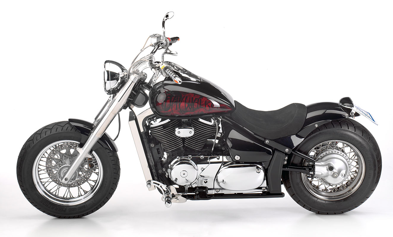 Der Vergaser wird nun durch einen Hypercharger beatmet, was nicht nur optisch ein Gewinn ist, sondern auch den Motor erheblich freier atmen lässt. Was frei atmet, muß bekanntlich die verbrannten Abgase auch wieder ins Freie entlassen, was hier über eine Competition Auspuffanlage geschieht. Um dem Bike eine völlig neue und tageslichttaugliche Optik zu verpassen wurde im Heck ein Breitreifenkit verbaut, so dass in der Schwinge nun ein 200er auf einer 6x15 Felge mit 54 Speichen den Kontakt zum Boden herstellt. Die Fender stammen ebenfalls aus unserer Produktion und sind in der kurzen oder auch in einer etwas längeren Form für alle Intruder Modelle erhältlich. Als Spritzschutz dient der aus Edelstahl gefertigte Nummernschildhalter, auf den ein Matrix-LED Rücklicht montiert wurde. Als Blinker verwendeten wir vorn und hinten Kellermänner, die hinten mit einer Delta Blinkerbrücke befestigt wurden.