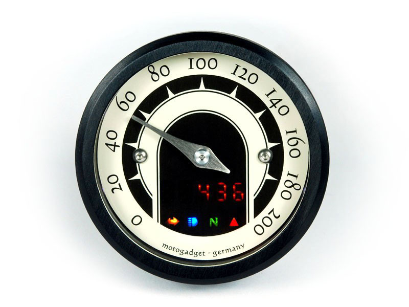Dial from 0 - 200, here at 20 km/h intervals on the face.
